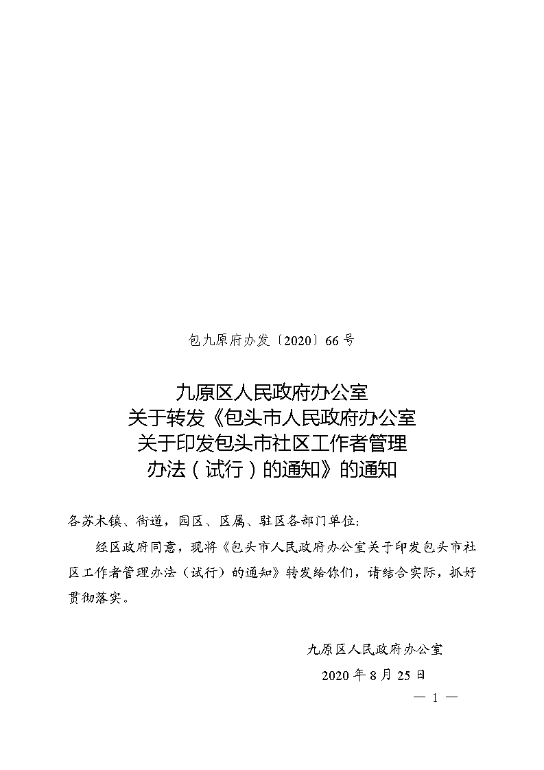 36365_好多假365平台_365bet线上棋牌区人民政府办公室关于转发《包头市人民政府办公室关于印发包头市社区工作者管理办法(试行)的通知》的通知